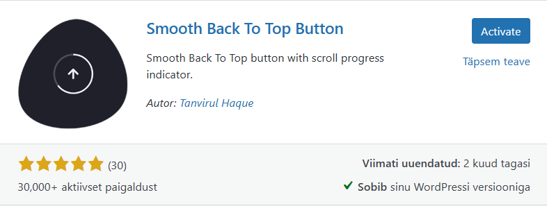 Smooth Back To Top Button plugin lisab WP lehtedele noole tagasi üles liikumiseks, millel on puhas animatsioon